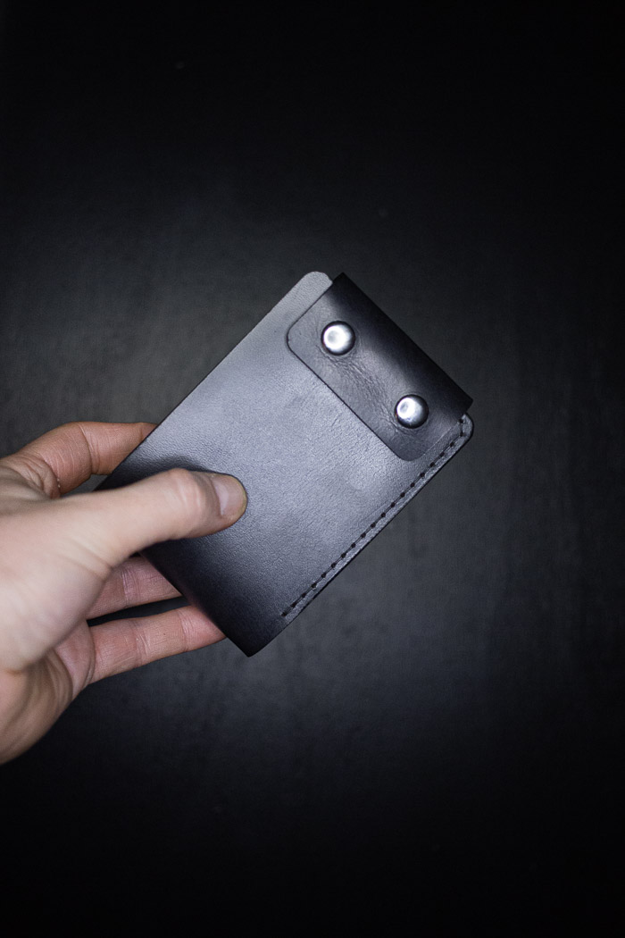 Left side card slot is made as a window. Wallet has two buttons to keep it closed. Small, slim wallet.